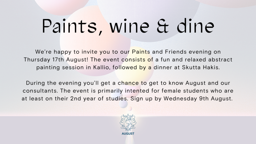 We are happy to invite Information and Service Management’s and Business Analytics’s female students (2nd year +) to enjoy a relaxed evening with August on Thursday 17.8.2023. The event is a great opportunity to learn more about strategy consulting and what it’s like at August.