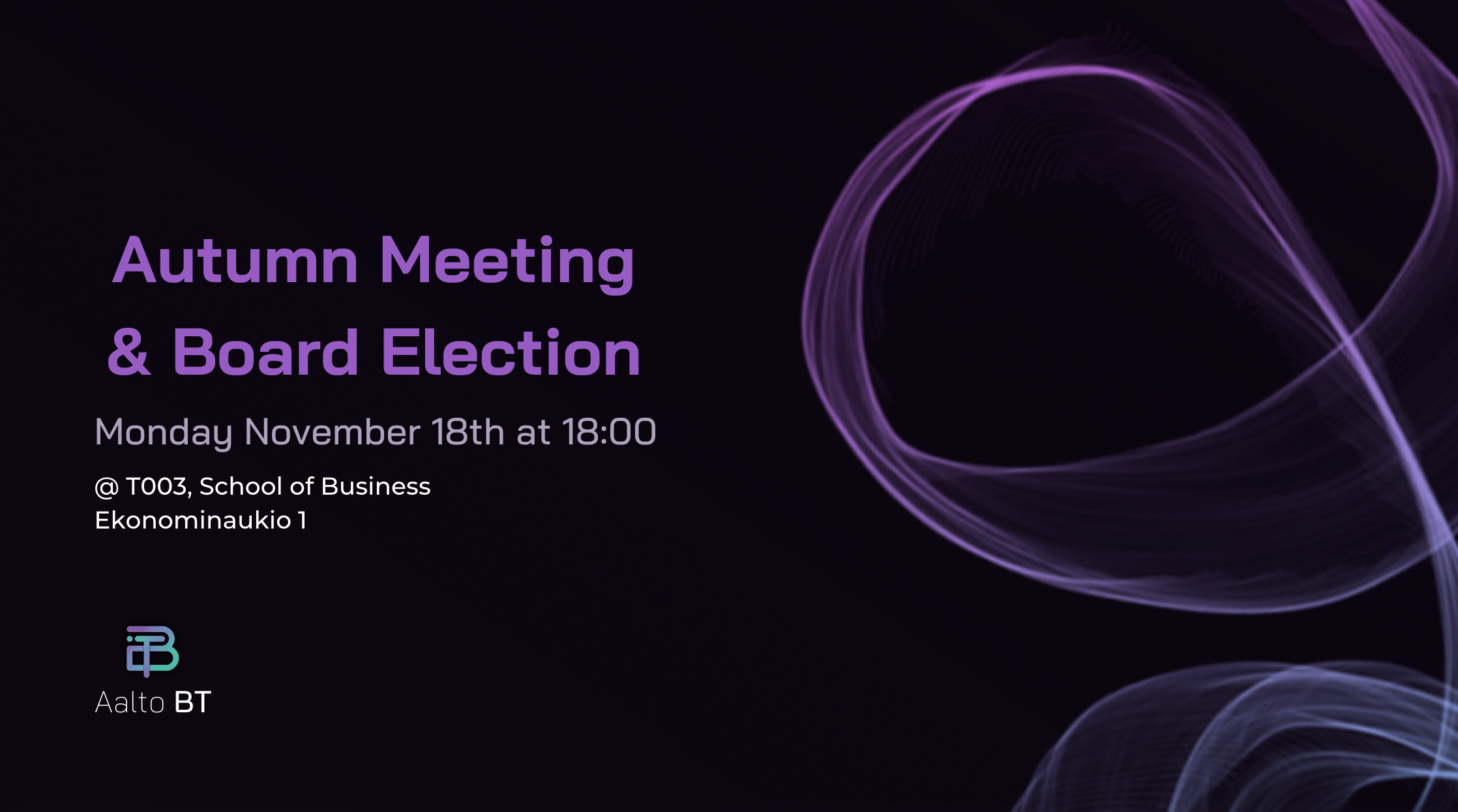Dear Aalto BT ry member, The Board of Aalto BT is happy to invite you to our autumn General Assembly (Autumn Meeting). The General Assembly has the highest decision-making power in our association and the Autumn Meeting elects the board for the year 2025. All members of Aalto BT have…