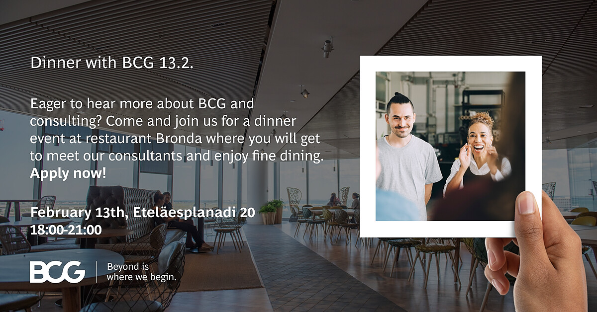 Ready for Dinner with BCG? Aalto Business students, you’re invited to an exclusive dinner with BCG at Restaurant Bronda on 13.2.2025 at 18:00. Enjoy fine dining while learningabout career paths, case interview tips, and the daily life of BCG consultants who share your background. Don’t miss this unique chance to connectand gain valuable insights! Who Can Apply? 2nd-year and above Aalto Business students. How to Apply? Apply through the link below by 3.2.2025 with your CV and University transcript. Apply here!