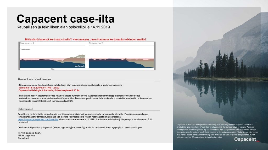 Olethan sähköpostitse yhteydessä (mikael.lagerroos@capacent.fi) jos sinulla herää etukäteen kysymyksiä case-iltaan liittyen.