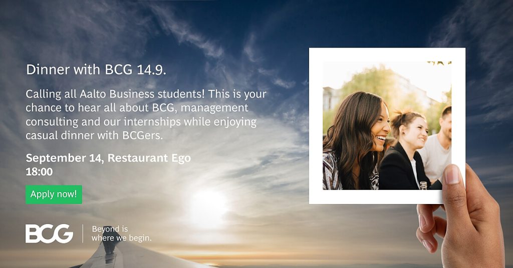 If you have any questions about the event, do not hesitate to contact Katja Leppänen at Leppanen.Katja@bcg.com. Also please inform us well beforehand in case you cannot make it to the event.