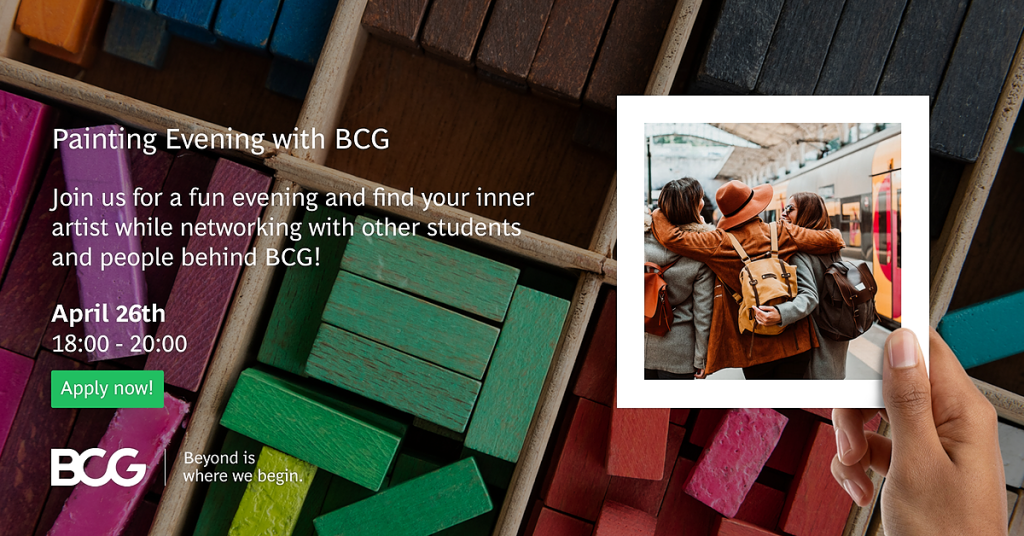 Get ready for an unforgettable evening of creativity, cocktails, and connections! Join us at our upcoming event on Wednesday 26th of April, hosted by Boston Consulting Group, where you’ll have the chance to unleash your inner artist and network with like-minded individuals. The event takes place at Studio & Bar, Eerikinkatu 11, Helsinki.