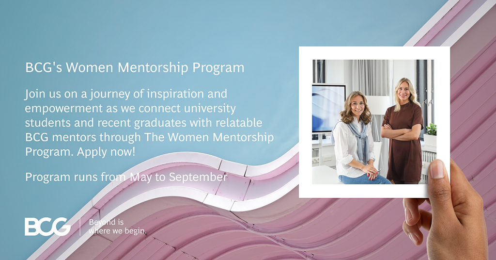 The Women Mentorship Program is a platform for university students and recent graduates to connect with BCG mentors who are relatable and inspiring. The program consists of events led by motivational facilitators, personalized 1-on-1 coaching sessions, and engaging group activities, all of which span over a period of 6 months.